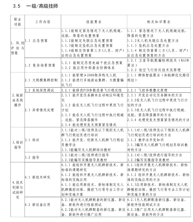 无人机群飞行规划员是从事无人机群飞行路线规划、飞行计划与任务制订以及飞行现场管理的专业人员(职业编码:4-02-04-07),涵盖无人机群表演规划员等工种。该职业划分为五个技能等级,从初级到高级层层递进: