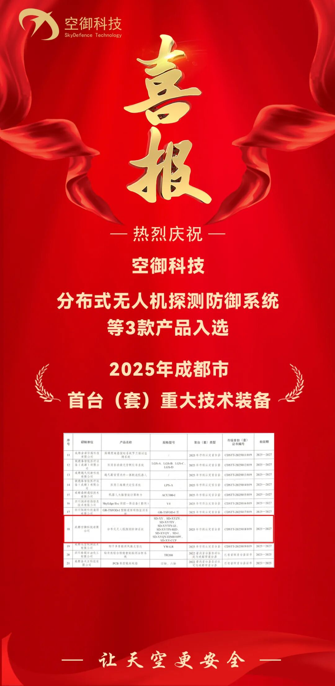 喜报 | 空御科技分布式无人机探测防御系统等3款产品入选2025年成都市首台(套)重大技术装备!