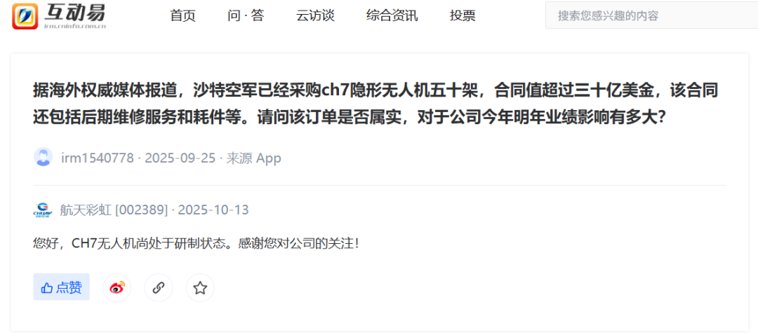 10月13日,有投资者在深交所互动易平台向航天彩虹(002389.SZ)提问:据海外权威媒体报道,沙特空军已经采购ch7隐形无人机五十架,合同值超过三十亿美金,该合同还包括后期维修服务和耗件等。请问该订单是否属实?对于公司今年明年业绩影响有多大?