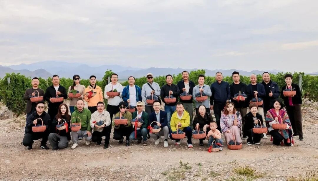 除了空中体验,活动还安排了丰富的地面项目。嘉宾们步入海拔1266米的赤霞珠园,手持小篮和剪刀,亲自采摘葡萄。一串串紫亮果实落篮的“咔嚓”声不断响起,贺兰山作为背景,藤蔓自然成框,举起刚剪下的葡萄,快门即出大片,丰收感与“紫色塞上”同框定格。